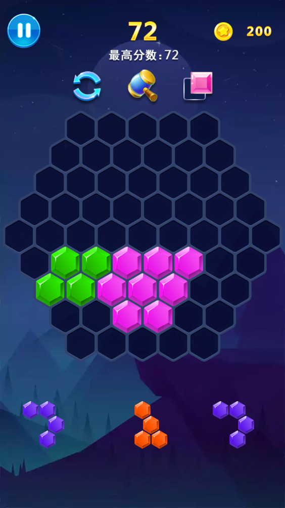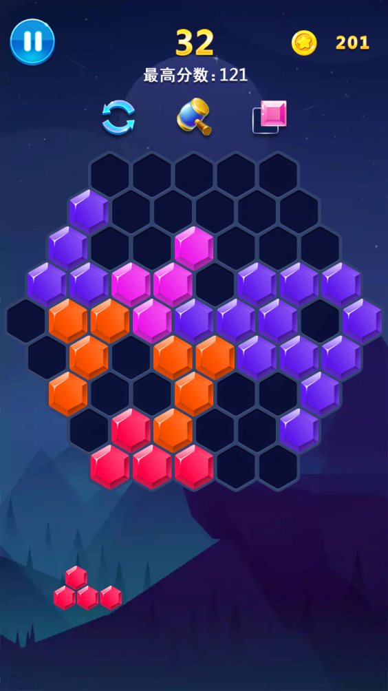 六边形消除:三种六角拼拼玩法,脑洞大开的智力考验,创意十足的游戏界面,由简入难的多变方块挑战,让你眼花缭乱,绝对过足瘾!